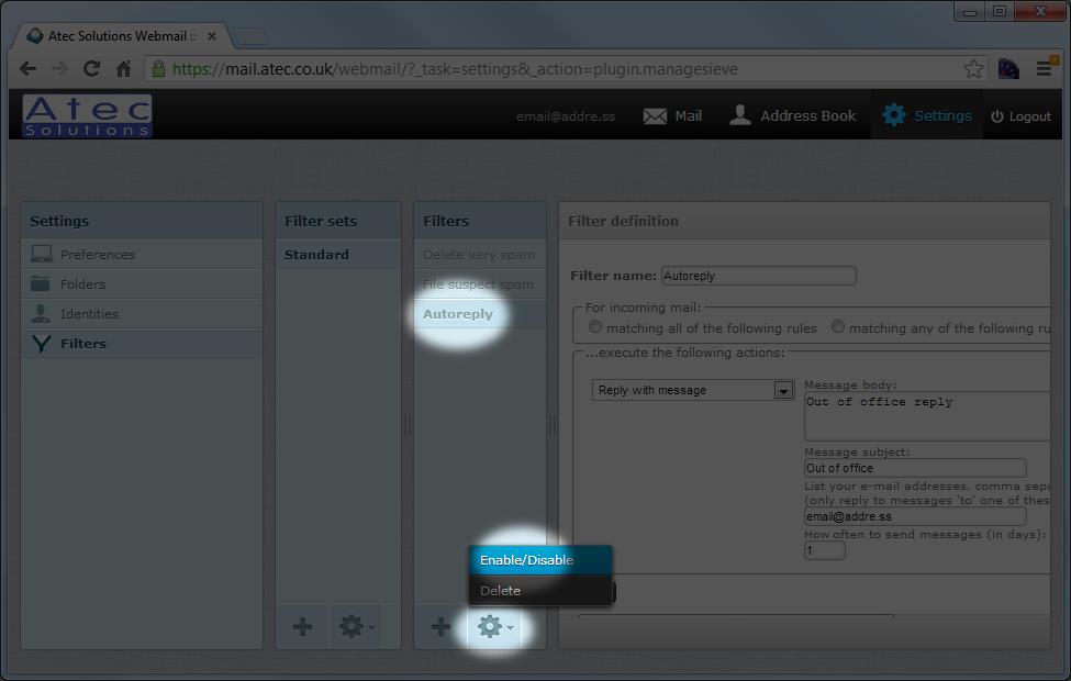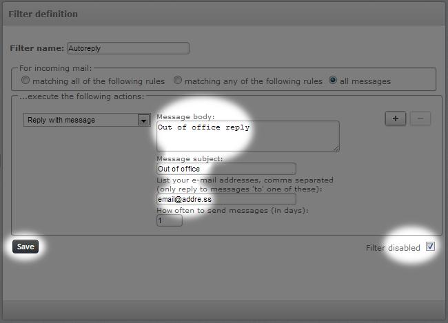 The Autoreply fields should be reasonably self explanatory; the only exception being the 'List your e-mail addresses' box... the autoresponder will only reply to emails which are specifically 'To' you - avoiding replying to mailing lists etc; this field allows you to define which addresses you want it to respond to. It will default to including each of the addresses from your webmail identities.